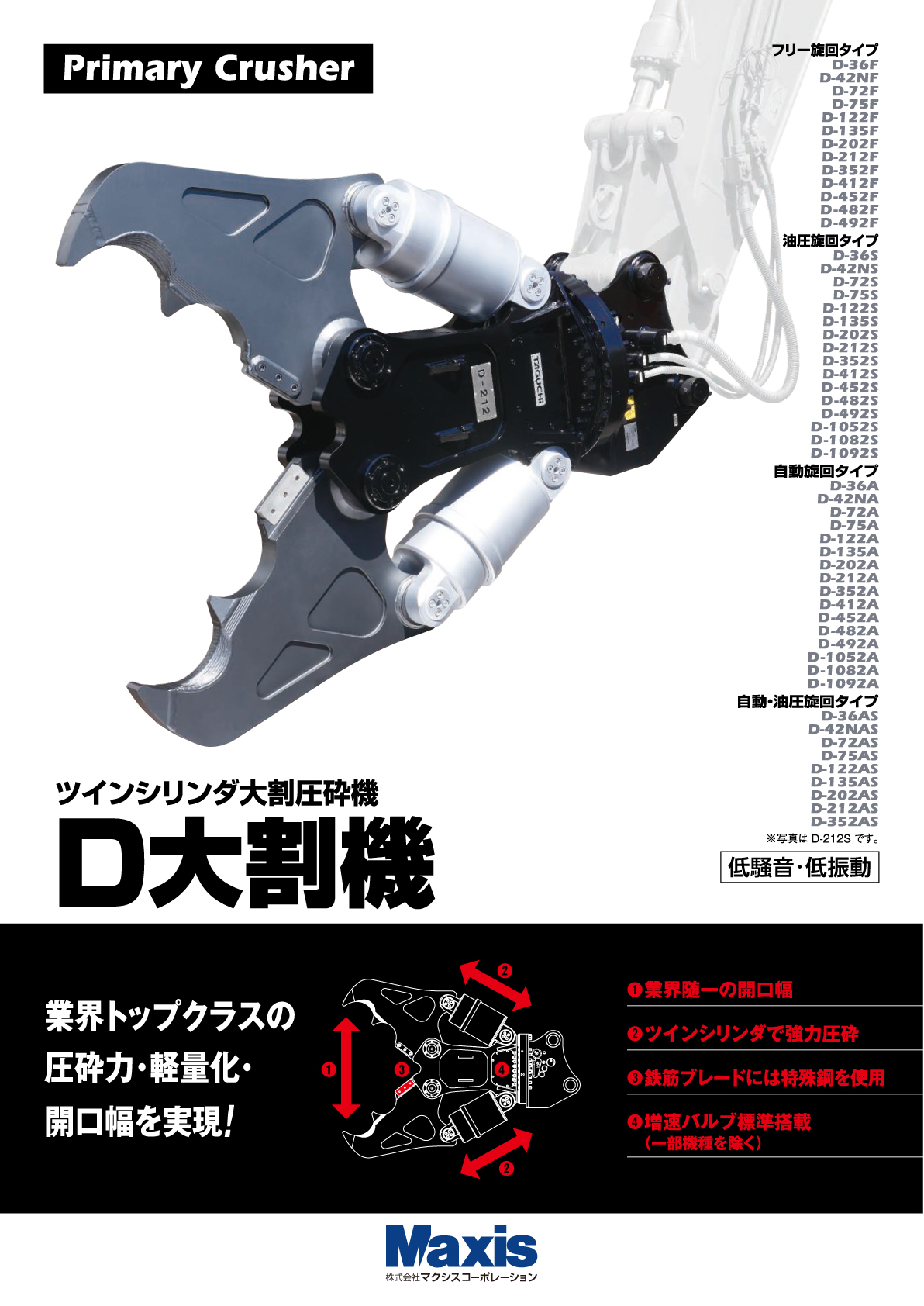 自社製シリンダにより圧砕力を保ったまま、広い開口幅を実現!D-212F/S/Aは1,300mm、D-352F/S/Aは1,550mmと業界最大開口幅を誇ります。増速バルブは標準搭載です(一部機種を除く)。