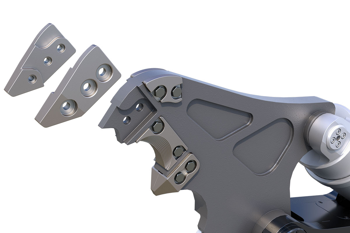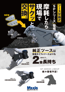 ボルトオンタイプの交換式「SPツース」を搭載したD大割機が登場! 交換式ツースは耐摩耗性に優れた素材を使用しているため、溶接タイプのツースよりも2倍長持ち(当社比)。ボルトオンタイプで、現場で摩耗した場合でもすぐに交換できるので、肉盛り等に時間をとられることもありません。
