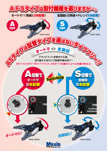 旋回方式はSタイプ(油圧全旋回)、Aタイプ(オートマ自動旋回)、そして業界初の旋回方式、ASタイプをラインアップ。従来のAタイプ、Sタイプが一つになったハイブリットモデルです。切り替えバルブによる簡単セットアップで、2本配管ショベルの場合は「Aモード=オートマ旋回」、5本配管ショベルの場合は「Sモード=全旋回」が選択可能です。