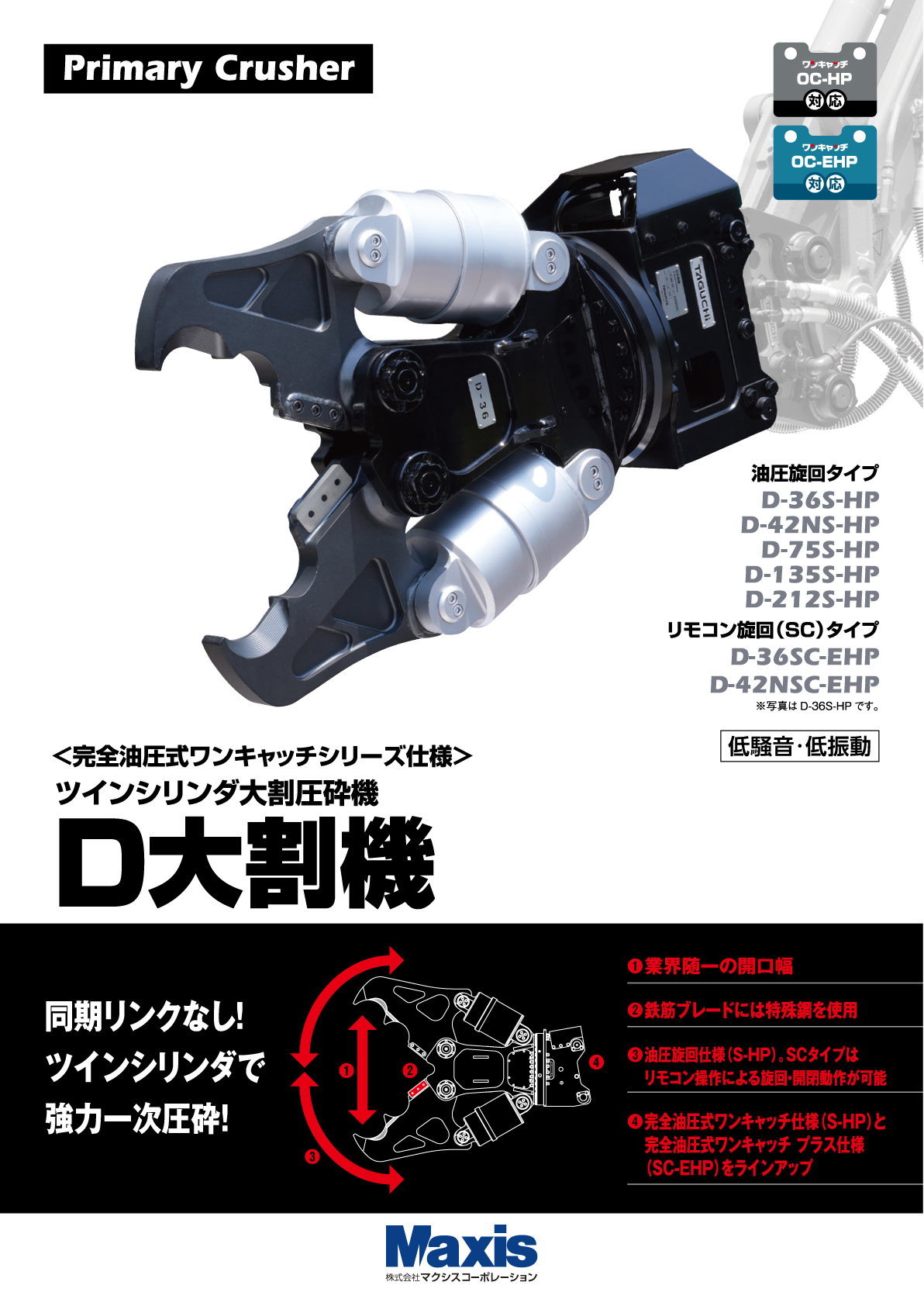 とにかく軽い! 同期リンクなしのシンプルなデザイン構造で軽量化を実現、メンテナンスコスト削減を可能としました。軽量ながらタグチこだわりの強固な削り出しアーム、ツインシリンダで強力圧砕。