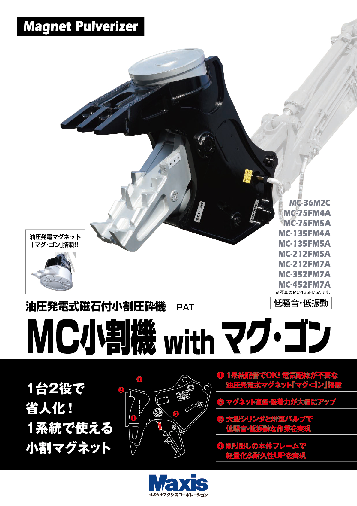 電気配線不要の油圧発電式マグネット「マグ・ゴン」(PAT)を搭載。バッテリー式マグネットよりも高い吸着力で、小割作業によって生じた鉄筋を効率よく回収できます。1機種でまったく異なるふたつの機能を同時に備えた画期的な新開発アタッチメントです。