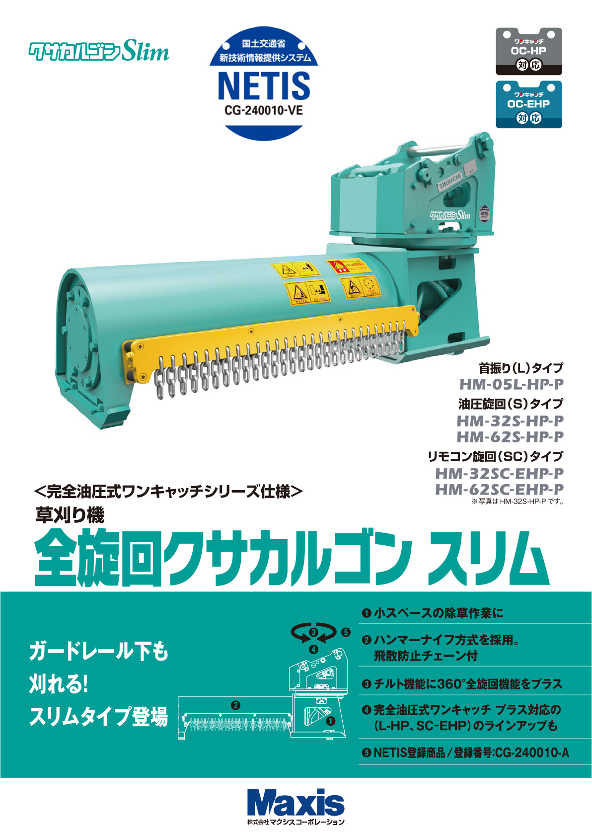 スマートかつコンパクトな設計で、ガードレール下など小スペースの除草作業が可能となりました。走行しながらの草刈り作業も可能です。どのモデルもチルト仕様なので刈り込み角度は自由自在。法面や斜面もきれいに刈り込めます。シリーズでは初の「全旋回タイプ」も登場! 追加配管が不要なSCタイプのため、1系統配管のまま、電気配線のみで旋回動作が可能です。