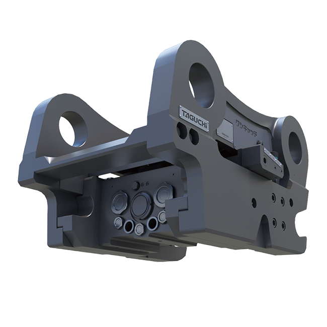 通常仕様のタグチ製アタッチメントでも問題ありません。専用の「アダプタのアダプタ」があれば、完全油圧式ワンキャッチの対応アタッチメントとして使用することができます。