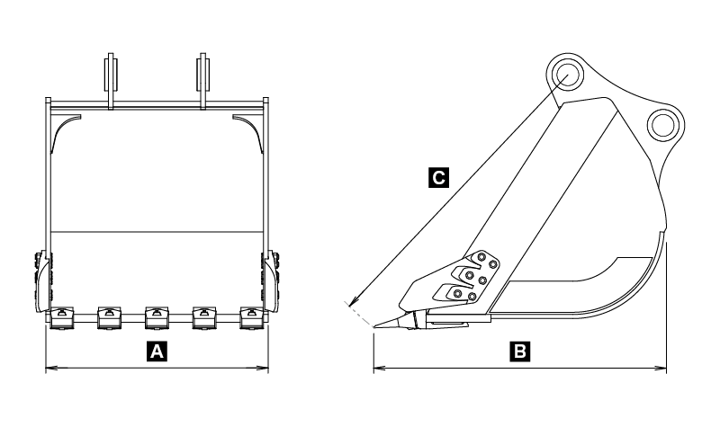 ![]() A:1,030mm バケット幅 B:1,360mm バケット奥行 C:1,475mm バケット長さ |