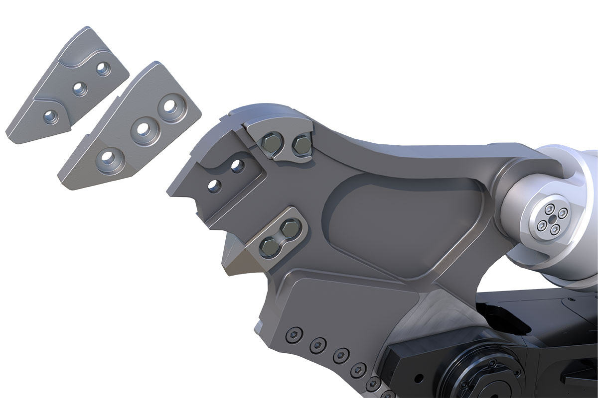 ボルトオンタイプの交換式「SPツース」を搭載した大割カッターが登場! 交換式ツースは耐摩耗性に優れた素材を使用しているため、溶接タイプのツースよりも2倍長持ち(当社比)。ボルトオンタイプで、現場で摩耗した場合でもすぐに交換できるので、肉盛り等に時間をとられることもありません。
