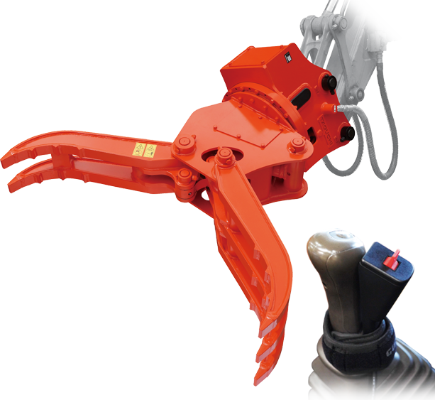 ロングセラー「グラスパー」に新モデルが登場。リモコン操作で旋回が可能な「グラスパー VSD」は、1往復の油圧配管のみでつかみ操作(開閉)はもちろん、360°旋回まで可能としました。キャビンに取り付けた旋回用スイッチを操作するだけで、左旋回、右旋回とリモコン操作での旋回が可能です。アタッチメント内に発電装置を設けているため、リモコン操作のための電気配線も不要です!