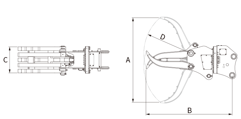 A:1670mm 最大開口幅B:1740mm 本体長さ C:470mm 爪幅 D:905mm 爪長さ |