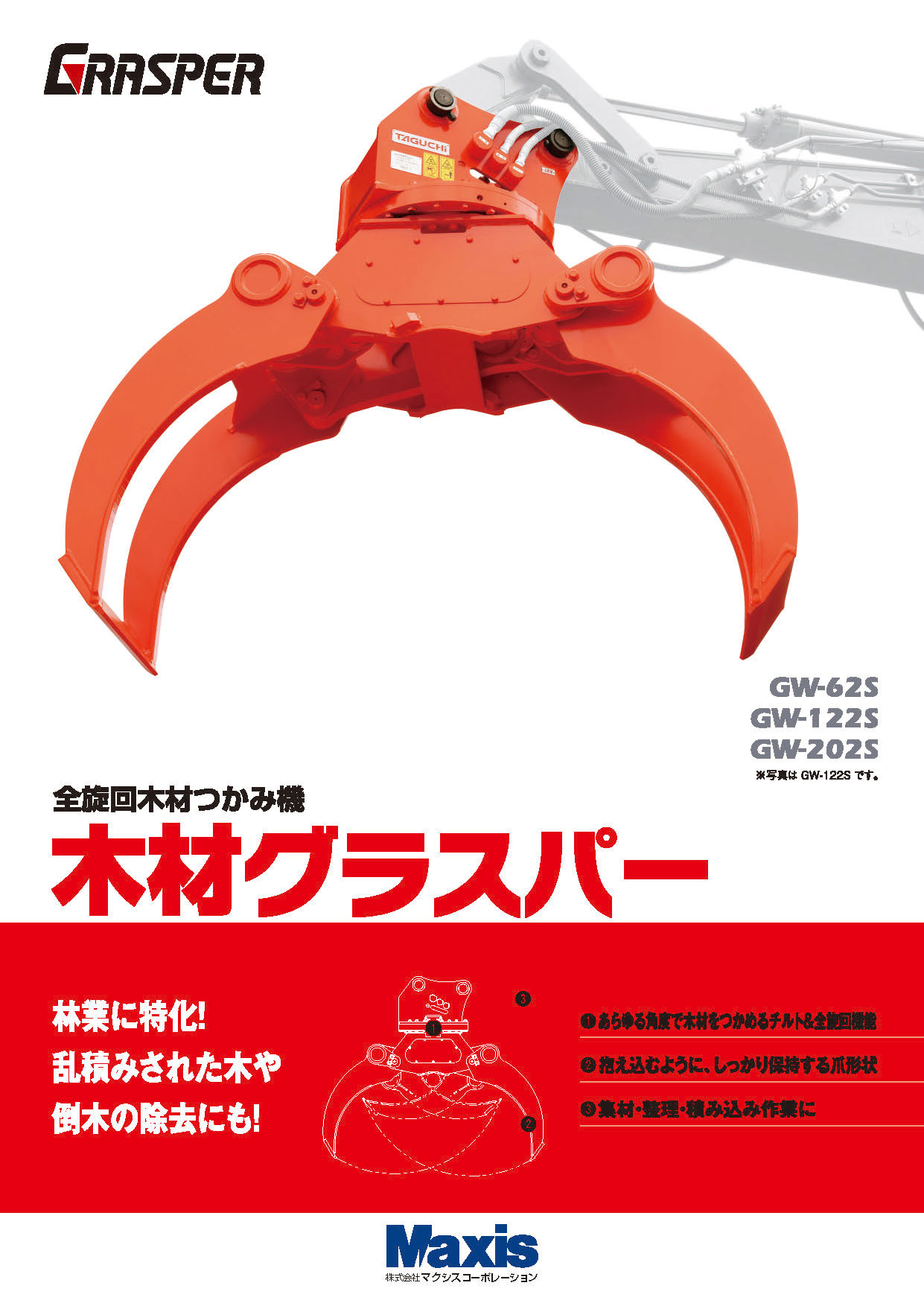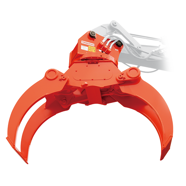 抱え込むように、しっかりとつかむことのできる爪形状で、材木への傷を最小限におさえます。長尺物の片つかみもしっかりと保持。本体内蔵の油圧バルブにより、油圧モータの破損を最大限に防止する構造となっています。