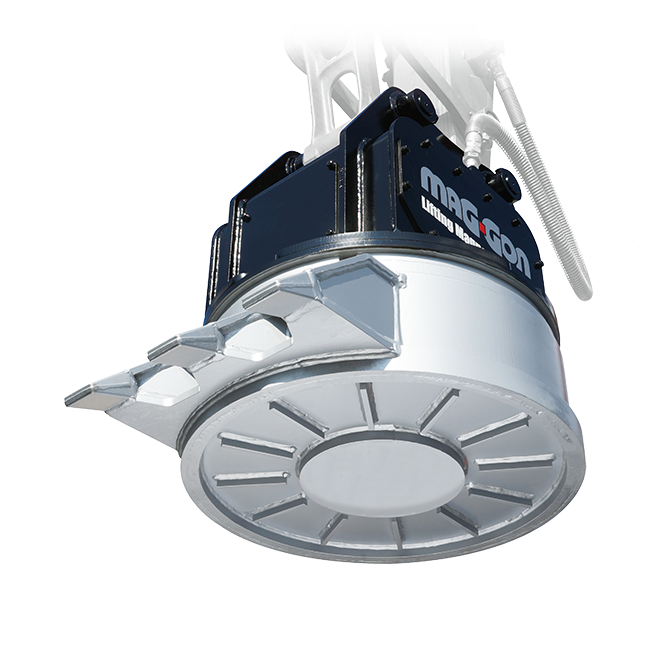 従来型がショベル本体側へ改造を加えなければならないのに対して、マグ・ゴンはカスタムが一切不要。ショベルの油圧を利用してマグネット本体にあるモーターを作動させ、電気、磁力を発生させます。1往復配管で使用でき、特別な手間をかけることなく取り付け後すぐにマグネット作業が行えます。追加バッテリーや発電機は不要です。